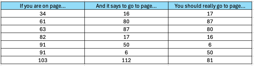 Upon learning this, I did what any rational person would do. I read through every possible choice in the book, took notes on what all the errors were, then figured out what pages they were really supposed to go to. So, if you, dear reader, are stumbling upon this blog thanks to a Google search of your own after you have also picked up a copy of the original 1984 printing of Vampire Express at a book sale, you are in luck! See the handy chart below for the corrections!