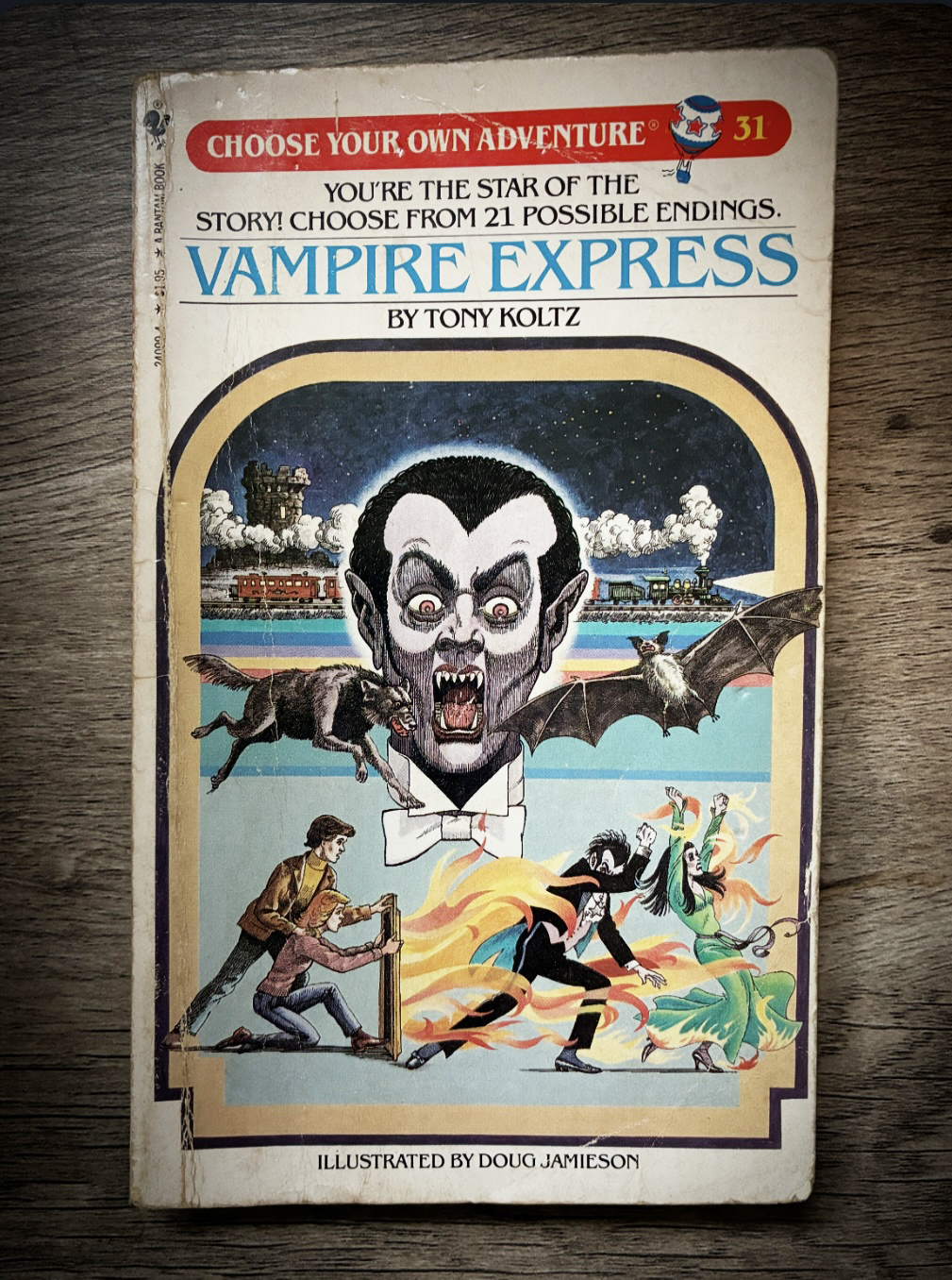 Last week I stopped into my local library to pick up an item that I had on hold. I hadn’t realized until I walked in that the library was having a huge used book sale. I perused the tables to see if anything caught my eye. I was pleasantly surprised to see a Choose Your Own Adventure book among the stacks of bargain books. I remembered the series fondly from my youth, having checked out many of them from that very same library when I was a kid. Vampire Express by Tony Koltz wasn’t one that I recalled reading, but for the price of 25 cents I couldn’t resist picking it up.