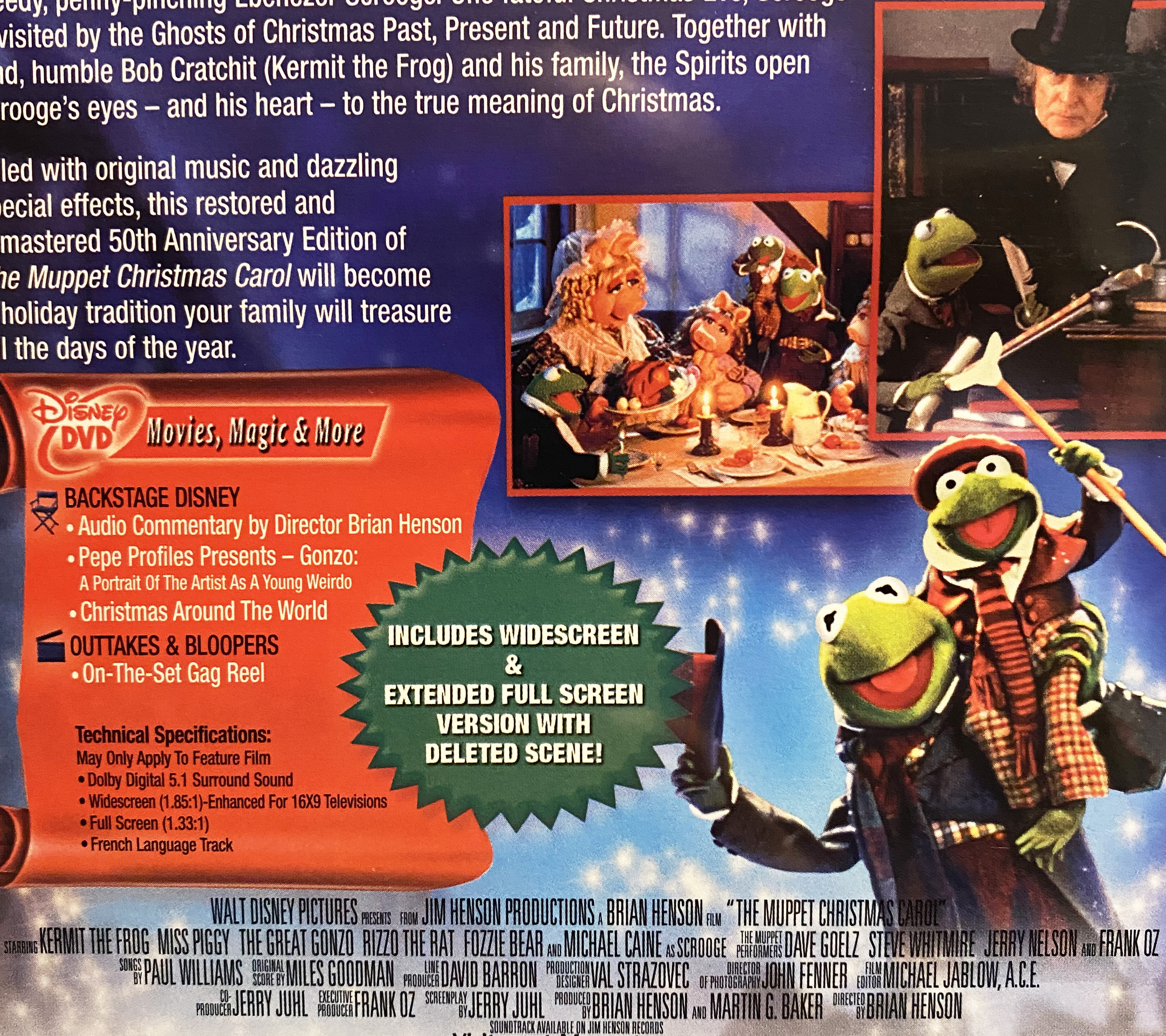 In the early 2000s, The Muppet Christmas Carol was released on DVD. As was not uncommon in this era, the DVD included both “full screen” and “widescreen” versions of the film. (DVDs were still relatively new and most TVs were 4:3 rather than 16:9. Audiences were used to home media releases being modified to fit their screens, so most movies had the picture cropped on the sides via the notorious practice of “pan and scan.”) Here’s where it gets interesting. The “full screen” version was the same as the VHS release, so it included “When Love is Gone.” The “widescreen” version was the theatrical cut, so it had the song omitted!
