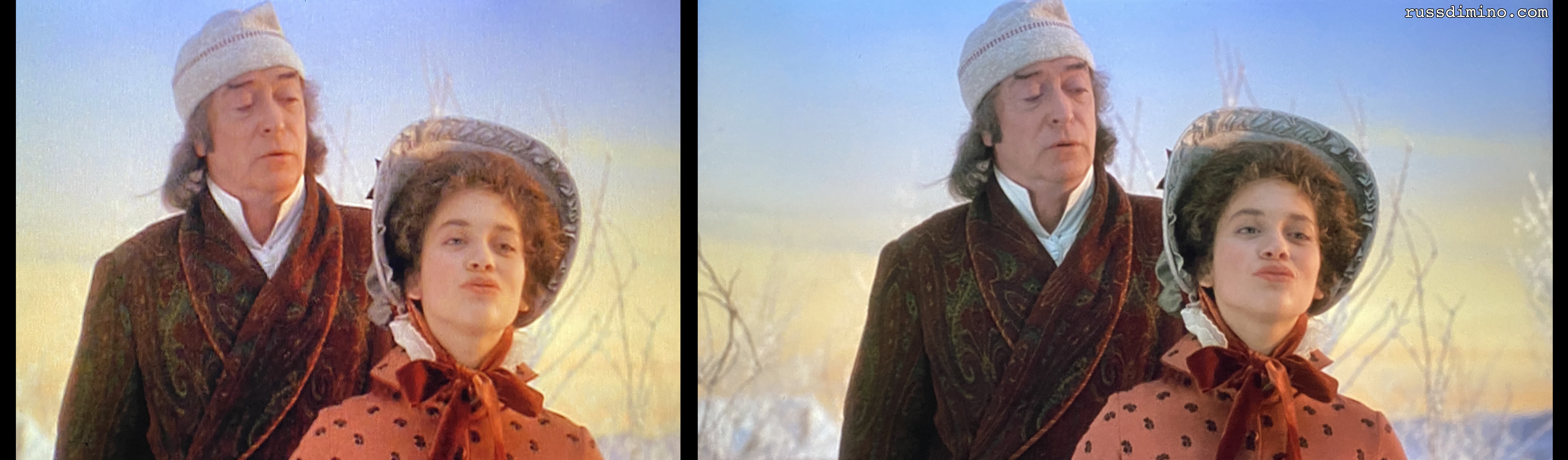Old Scrooge, though he only exists in ghost form and cannot be seen or heard by young Belle, stands beside her and joins her in singing. It’s the first time we’ve heard Scrooge sing. Michael Caine purposely doesn’t match Ms. Braun note for note. His timing is a little off from hers; he is about a half a beat or so behind her.