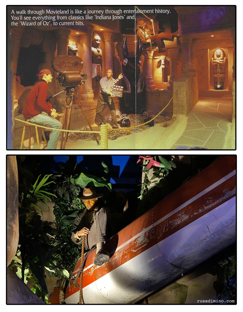 Movieland originally had an Indiana Jones display at the entrance to the museum, where Indy was suspended from the ceiling via a rope. This can be seen in a photo from that 1990s brochure. Today the same figure is still in the museum, but he’s been relocated to a completely different display.