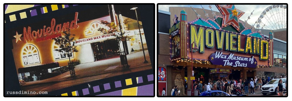 The original Movieland location can be seen in a photo from an old brochure that I still have from the 1990s. Note that it was just called “Movieland Wax Museum,” and they had not yet added the “Of The Stars” to its title. The current location is in the photo on the right for comparison.