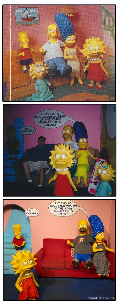 One of the first scenes Movieland added that visitors could pose in was The Simpsons, sitting on their famous living room couch. As you can see from these pictures, that scene has changed over the years as well. The first photo is from that old brochure, and you could not pose with the family – note that Bart is standing on the couch. The second photo, taken in 2002, moved Bart to a stairwell and allowed fans to sit on the couch next to Homer, who was wearing a new shirt. In the third photo, taken in 2024, note that both Homer and Marge have changed clothes, and baby Maggie is missing.